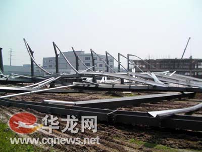 記者在現(xiàn)場看到,鋼架大約高10米左右,整個房屋鋼架已經全部垮塌,鋼架橫七豎八地散落在工地上,工地上的一輛工程車被落下的鋼架翻了個底朝天。據(jù)現(xiàn)場一位工人介紹,14日上午10時40分左右,他正在對面的在建廠房上做木工,突然聽到“轟”的一聲,“當時我就只看到廠房的鋼架全部垮了下來,幸好當時沒有好多人在房子上施工喲!”該工人告訴記者,當時只有2名工人正在鋼架屋頂上施工,鋼架垮塌后,該2名工人受傷,后被及時送往了醫(yī)院。