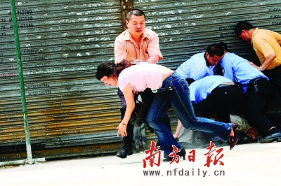 身邊的談判專家急中生智,將鄺女士從張×述身邊拉開。數(shù)十名警察一擁而上,將張×述按倒在地,此后有人抬手,有人抬腳,有人抬頭,張×述便被警察抬進(jìn)了工地旁邊的三元里派出所。