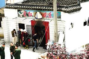 “愛(ài)紅棋牌室”西側(cè)緊挨古運(yùn)河,在一條名為“缺口河?xùn)|小街”的巷子的最里面。記者在現(xiàn)場(chǎng)看到,“愛(ài)紅棋牌室”東、南、北3面道路周圍都被警方用2至3道警戒線封鎖,大量警力在現(xiàn)場(chǎng)維持秩序。由于圍觀群眾太多,躍進(jìn)橋上的警戒線出現(xiàn)了多次被人潮擠斷的情況,民警及時(shí)進(jìn)行修復(fù)和更換。