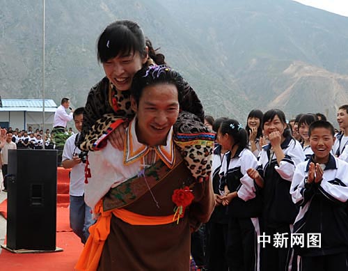 中新社隴南五月十日電 (唐明 劉啟舒)“春天的花兒多鮮艷,藍(lán)天的彩霞像錦緞,唱上一支心中的歌兒,獻(xiàn)給我們的支教老師,祝您生活幸福美滿(mǎn)……”五月八日,汶川地震重災(zāi)區(qū)--甘肅文縣石雞壩中學(xué)的學(xué)生和老師跳起了歡樂(lè)的鍋莊舞,唱起心中的歌兒,為一對(duì)喜結(jié)良緣的新人祝福。