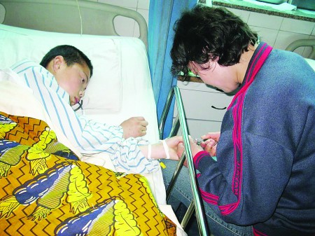 11日中午,與明明家做鄰居多年的張先生風(fēng)塵仆仆趕到醫(yī)院看望明明,剛走進(jìn)病房看了明明一眼,他就不忍心看第二眼,走出病房后,這位30多歲的漢子蹲在病房外流下了眼淚。