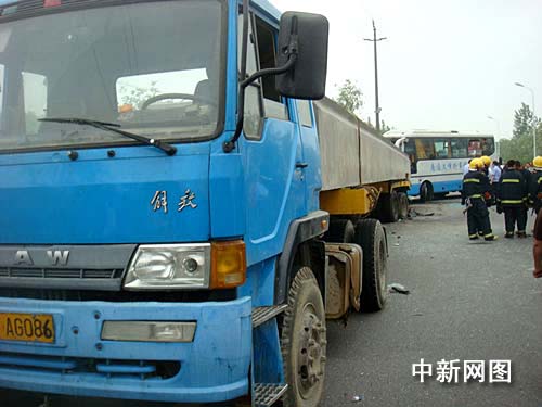 當(dāng)日上午,當(dāng)?shù)鼐浇拥綀?bào)警,稱(chēng)兩車(chē)發(fā)生相撞,有重傷員被困,情況危急。接警后,當(dāng)?shù)囟嗝拦俦徒谎簿⒓蹿s到現(xiàn)場(chǎng)。此時(shí),救援人員發(fā)現(xiàn)一輛牌照為蘇FAG開(kāi)頭的裝載著兩根橋梁大梁的超大型解放拖掛平板車(chē)與一輛南通牌照的大客車(chē)撞在一起,平板車(chē)上一根橋梁大梁直插入客運(yùn)車(chē)右側(cè)三分之二處,車(chē)上有五人被嚴(yán)重變形的座椅困在車(chē)廂內(nèi),身受重傷。