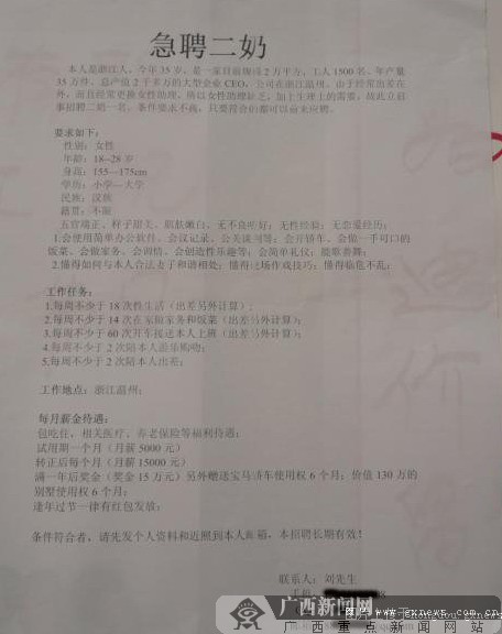 記者在網(wǎng)上找到了這張啟事的圖片,上面介紹說(shuō),招聘二奶的主角是浙江溫州一家服裝公司的CEO,姓劉,招聘的目的是為了滿(mǎn)足“工作出差、生活上的需要!