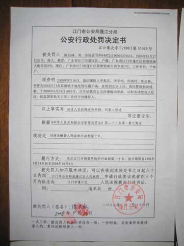 但是,對(duì)于江門日?qǐng)?bào)刊登的報(bào)道,一名網(wǎng)友給本網(wǎng)提供了《行政處罰決定書》的圖片,在該圖片上可以清楚地看到,決定書上寫著“現(xiàn)查明2008年9月16日,違法嫌疑人……因?qū)T市荷塘鎮(zhèn)土地使用問題不滿,意圖到北京上訪。我民警根據(jù)此線索,于2008年9月24日10時(shí)許,在車站抓獲五名涉嫌煽動(dòng)串聯(lián)、以財(cái)務(wù)誘使他人信訪,擾亂國家機(jī)關(guān)正常工作秩序的嫌疑人”,在決定書下方有被處罰人簽名和指模,以及江門市公安局蓬江分局蓋印。該名網(wǎng)友同時(shí)提出質(zhì)疑,聲明摘錄如下: