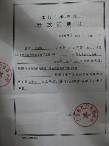今日(18日),據(jù)《江門日?qǐng)?bào)》報(bào)道,蓬江區(qū)負(fù)責(zé)人表示,李浩林等人因涉嫌破壞生產(chǎn)經(jīng)營被依法刑事拘留,目前案件已進(jìn)入司法程序,市公安局蓬江分局有關(guān)負(fù)責(zé)人指出,自從2005年起,李浩林、李賀明召集陳啟林、何瑞釗等人,采用阻擋機(jī)械運(yùn)作等方式阻撓合法基建項(xiàng)目正常施工……蓬江區(qū)公安分局依法以涉嫌破壞生產(chǎn)經(jīng)營罪于2008年10月3日對(duì)為首者李浩林、李賀明依法刑事拘留。對(duì)情節(jié)較為輕微的陳啟林、何瑞釗等人依法行政拘留。同時(shí),陳啟林、何瑞釗等人18次到國家、省有關(guān)部門上訪,均得到明確答復(fù),公安機(jī)關(guān)也從未因村民上訪拘留過任何人。