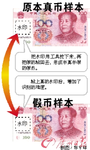 犯罪嫌疑人采用挖補方式,將真幣的水印挖出來后,用膠水粘貼到假幣當中,原來的真幣則填充上假的水印,填充上假水印的真幣也成了假幣,“這樣100元就變成了200元,嫌疑人造出假幣后就馬上到柜員機存入假幣,再到另一個柜員機取出真幣,繼續(xù)偽造!