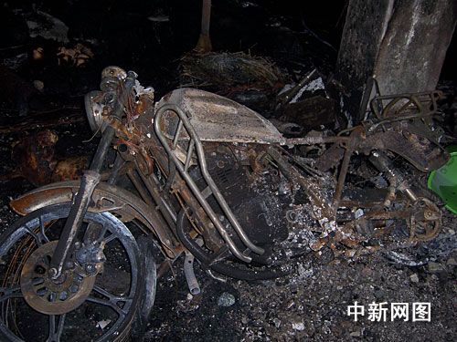 在一樓火災(zāi)事故現(xiàn)場(chǎng),記者看到房屋已被燒得漆黑一片,中間部位堆放的一些輔料和半成品全部過(guò)火,靠墻的一邊有一輛被燒毀的摩托車(chē)。輔料被燒后產(chǎn)生的大量濃煙將墻壁熏得灰黑。