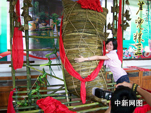 這個(gè)端午節(jié)小黃金周,在嶺南最大的古典私家園林中山詹園里,游客可以親自見(jiàn)證1.88米高的巨無(wú)霸蘆兜粽。該巨無(wú)霸大粽子由中山傳統(tǒng)裹粽大師,用了三天時(shí)間,動(dòng)用數(shù)百斤包括糯米、紅綠豆、豬肉等材料制作而成。5月26日,1.88米巨型蘆兜粽現(xiàn)身在詹園!斑沒(méi)見(jiàn)過(guò)這么大的粽子!”游客劉先生驚訝地說(shuō)。目見(jiàn)如此龐大的巨粽,游客們都紛紛爭(zhēng)先上前留影。