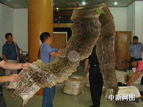 據(jù)防城港市森林公安清點統(tǒng)計,警方截獲的大貨車內(nèi)共有173只熊掌、4張蟒蛇皮和國家二類保護動物穿山甲1只。其中,最長的蟒蛇皮達(dá)5米。