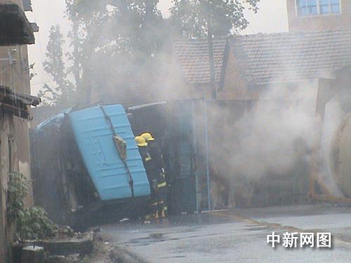 消防隊員趕到現(xiàn)場時,只見一輛槽罐車側翻橫在村道中間,車頭部將右邊車道旁的兩間房子撞了兩個大窟窿,整個槽罐已脫離車身,躺在路邊水溝內,泄漏的硫酸不斷流入旁邊的水溝,冒出白色的煙霧,空氣中充滿了刺鼻的味道,幾百米外都能聞到。消防隊員在現(xiàn)場,明顯感到喉嚨干澀,許多村民用毛巾、衣角捂住口鼻,退至安全地帶。
