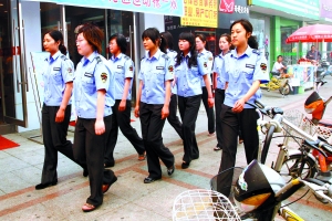 昨日,(江蘇)連云港市東?h女子城管隊員在縣城步行街巡邏。為充分發(fā)揮女性在城管執(zhí)法工作中特有的耐心、細(xì)心和善于溝通等特點,著力打造城管行政執(zhí)法新亮點,近日,連云港市東?h成立了城管行政執(zhí)法大隊女子中隊。該女子中隊目前共有10名隊員,主要負(fù)責(zé)在中心城區(qū)主干道進行城管巡查,通過女性特有的親和力和感染力,化解執(zhí)法過程中出現(xiàn)的矛盾。