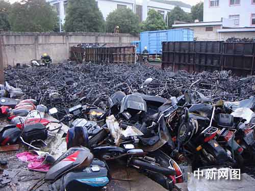 中新網(wǎng)寧波7月8日電(何蔣勇 歐陽峰)7日下午5時(shí)50分許,位于浙江省寧海縣興寧中路45號(hào)的寧?h物資再生利用有限公司發(fā)生一起火災(zāi),濃煙沖天達(dá)百余米高,整個(gè)寧海縣城都能清楚地看到黑煙滾滾。當(dāng)?shù)叵啦块T先后出動(dòng)四輛消防車、近四十余名官兵參與火災(zāi)撲救,約40分鐘后成功將大火撲滅,但是該公司露天堆場(chǎng)內(nèi)近百輛廢舊摩托車被大火燒成骨架。