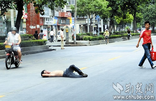 事發(fā)昨日正午,記者在漢陽(yáng)郭茨口看到,一名男子上身裸露,手提一袋醫(yī)院的病歷資料,情緒激動(dòng)地躺在馬路中央,脊背被路面燙得通紅。此時(shí)路面車流不息,該男子處境十分危險(xiǎn)!翱彀阉貋(lái)!”幾名路人見狀后,靠近該男子,欲將其拉到路邊,但該男子并不領(lǐng)情,堅(jiān)決不起身。幾分鐘后,二橋派出所的民警趕來(lái),要求該男子去派出所再說(shuō),該男子置之不理。民警表示,早8時(shí)許和10時(shí)許,該男子曾在附近路面躺過(guò)兩次,都被他們帶回了派出所,他們這已是第三次為該男子出警!坝惺裁次驼f(shuō)出來(lái),那樣心里痛快點(diǎn)。”見民警束手無(wú)策,熱心路人們開始輪番上前勸解。眾路人汗流浹背,頂著烈日站在馬路中央,對(duì)該男子動(dòng)之以情、曉之以理。半小時(shí)后,該男子陸續(xù)說(shuō)出了心中的不快。又經(jīng)勸解,該男子終于答應(yīng)跟民警回派出所,將事情說(shuō)清楚。