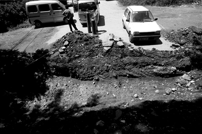 昨天下午,復(fù)地灣流匯別墅區(qū)門(mén)前,6米寬的柏油路被橫挖開(kāi)一道近1米深的溝,10多輛車(chē)停在溝邊。住在別墅區(qū)一期的一位業(yè)主稱,此路于18日下午被挖斷,業(yè)主們只能將車(chē)停在溝邊后步行回家,正在裝修的業(yè)主則因道路不通而不得已停工,“也不知到底因?yàn)槭裁矗缘懒恕薄?