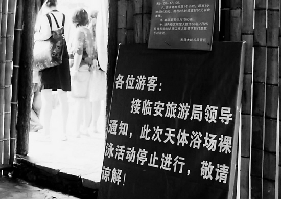 一位男游客率先發(fā)現(xiàn)了公告牌—— “各位游客:接臨安旅游局領(lǐng)導(dǎo)通知,天體浴場裸泳活動停止進(jìn)行,請各位原諒!”