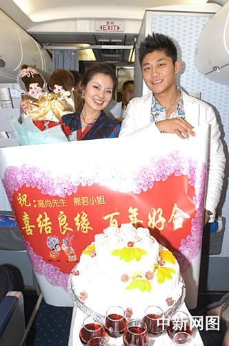 中新網南京七月二十六日電(青志信 潘忠威 朱曉穎)“女士們、先生們,本次航班上有一對戀人,此時想在萬米高空上讓大家見證他們的海誓山盟。乘坐本次航班二十六D座的熊君小姐,你的男朋友高尚先生希望你能夠答應嫁給他!他要照顧你一輩子!”話音剛落,一個帥氣小伙走進經濟艙,單膝跪地對姑娘說:“我愛你,嫁給我吧!”,隨后為她戴上婚戒。