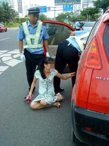 昨日上午9時(shí)30分許,?谑旋埨ツ下肥D幼保健院門口路段發(fā)生如此一幕:一名30多歲的女子因駕車時(shí)未系安全帶被執(zhí)法交警攔下,該女子看到交警準(zhǔn)備開(kāi)罰單時(shí),試圖搶奪自己的駕駛證,但沒(méi)能得逞。該女子見(jiàn)狀,竟抱住交警,稱被交警“摸胸”,并開(kāi)始辱罵交警。隨后,交警決定暫扣車輛并將其拘留時(shí),該女子又坐在地上哭鬧起來(lái),F(xiàn)場(chǎng),數(shù)十位圍觀的市民目睹了這一情景,哭笑不得。
