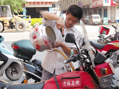 網(wǎng)友“墜入情!痹谔又蟹Q,該加油站位于開縣移民新城南山中路!白钆5木褪怯靡粋大水壺給摩托車加油”。加油站準(zhǔn)備了幾個大水壺,壺嘴上都安上一節(jié)水管,每個水壺連壺蓋都沒有。摩托車司機需要自己拿水壺到加油機前打油,加油站工作人員也不管。發(fā)帖者說:“汽油是一種很容易揮發(fā)的物質(zhì),但壺口是敞開的,在加油過程中,大量的汽油極易揮發(fā)出來,加油站彌漫著一股刺鼻的汽油味道,存在著嚴(yán)重的安全隱患。”