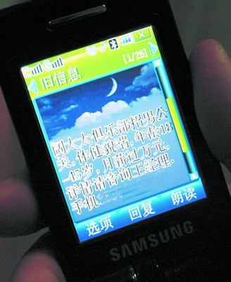 “闊太太俱樂(lè)部招男公關(guān),體健貌端,年齡18歲至45歲,月薪過(guò)萬(wàn)元。詳情請(qǐng)咨詢王經(jīng)理,手機(jī)13×××××××××!2008年4月20日,徐州市民張群(化名)突然收到一條招聘短信!霸率杖脒^(guò)萬(wàn)元啊,有這么好的事情!睆埲杭泵仉娫掃M(jìn)行咨詢。一位自稱李經(jīng)理的人接了電話,一番詢問(wèn)后,李經(jīng)理對(duì)張的條件很滿意,并約定在徐州開(kāi)源名都大酒店(五星級(jí))進(jìn)行面試!澳愕搅艘院缶偷酱髲d打我電話,我們會(huì)派人對(duì)你進(jìn)行考察!崩罱(jīng)理說(shuō)。
