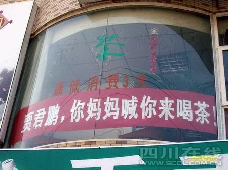 再三追問下,來自重慶農(nóng)村的陳先生如實(shí)說,他平時(shí)喜歡上網(wǎng),看到“賈君鵬,你媽媽喊你回家吃飯”這句新的網(wǎng)絡(luò)流行語后,一下子勾起了自己童年的回憶,想起那個(gè)時(shí)候,每天傍晚,媽媽都要喊他回去吃飯的情景。而前兩天,他在網(wǎng)上看到一張照片,重慶的一家火鍋店竟然掛出一條橫幅,上面寫著:“賈君鵬,你媽媽喊你來吃火鍋!”他頓時(shí)靈機(jī)一動(dòng):“我為什么不能依葫蘆畫瓢,也掛一個(gè)橫幅呢?”“那為什么要寫成‘喝茶’呢?”陳先生說:“我這是茶樓,不管飯也不管吃火鍋,打麻將倒是可以,但總不能寫成‘賈君鵬,你媽媽喊你來打麻將’噻,所以就寫成來喝茶了!敝劣谶@橫幅有沒有給茶樓打廣告的意思,陳先生坦言:“也許有一點(diǎn),但一來估計(jì)廣告的效果并不大,二來從自己的本意來說,娛樂的成分還要大過廣告的成分!