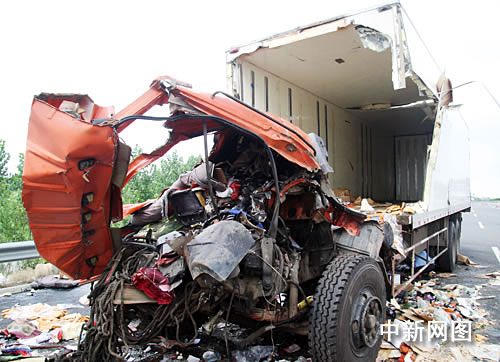 記者在事故現(xiàn)場(chǎng)看到,冷藏車(chē)受損嚴(yán)重,車(chē)頭完全變形,貨箱內(nèi)的食品貨物散落一地,地面布滿機(jī)油和血跡,車(chē)輛后方地面無(wú)明顯剎車(chē)痕跡。該路段半道已經(jīng)封閉,車(chē)輛通行基本順暢,現(xiàn)場(chǎng)來(lái)了拖車(chē)抓緊清理。
