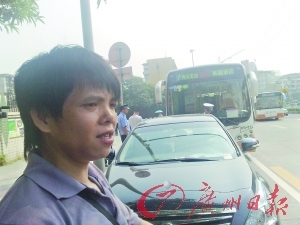 記者在上午10時(shí)許趕到事故現(xiàn)場(chǎng)。在先烈中路小學(xué)門前,停著一輛車牌號(hào)為“粵A 59743”的862路公交車,旁邊停著一輛簇新的天籟轎車,臨時(shí)車牌“粵AD5460”被放在駕駛臺(tái)上。據(jù)悉,這輛天籟轎車才“下地”3天。記者在現(xiàn)場(chǎng)看到,天籟轎車左側(cè)后門被刮傷,原本的亮黑色有五分之一被刮花,兩名司機(jī)正分別接受警察的訊問。20多歲的公交車司機(jī)嚴(yán)尚海左眼紅腫,左邊臉也腫起一塊,額頭傷口滲血,上下嘴唇均破裂流血,上衣血跡斑斑。30來歲的轎車司機(jī)鄭某則一臉茫然地站著,臉上未見傷痕,淺色上衣也沾有血跡。