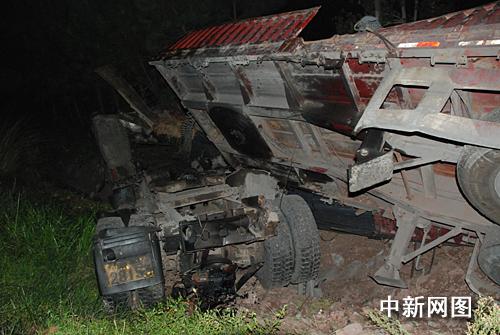 4時(shí)15分,消防隊(duì)員趕到事發(fā)路段,只見(jiàn)大掛車正翻倒在路旁,由于側(cè)翻時(shí)車體與地面產(chǎn)生摩擦非常大,掛車車頭嚴(yán)重變形,滿載的鋼筋及車體碎片散落一地,事故現(xiàn)場(chǎng)能清晰的看到一條磨擦印。此時(shí),副駕座上的一男子整個(gè)身體都已被甩出駕駛室外,但是該男子頭部卻被卡在右側(cè)車窗處,經(jīng)現(xiàn)場(chǎng)救護(hù)醫(yī)生判斷該名人員已沒(méi)有了生命體征,已經(jīng)死亡。