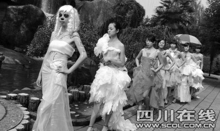 活動現(xiàn)場,七八名大學生美女志愿者身穿五顏六色,用紙袋、塑料袋、筷子和孔雀羽毛等奇異材料制成的服裝為游客們獻上了一場別出心裁的時裝秀,向每一位游客宣傳環(huán)保理念。據(jù)了解,這些紙裝是武漢一高校服裝設(shè)計專業(yè)的學生精心制作的,他們希望和成都的同學共同呼吁市民愛護環(huán)境。來自武