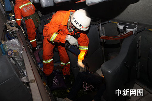 經(jīng)過半個多小時的緊張施救,側翻的大客車被吊起?蛙囓嚿磔p微變形,擋風玻璃粉碎,車窗不同程度破碎。被壓車底的兩名乘客經(jīng)現(xiàn)場醫(yī)生檢查,無生命跡象,當場死亡。