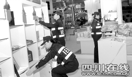 昨晚10點(diǎn),新會(huì)展中心各展館里一片忙碌。在一群正在安檢的帥氣黑衣特警中間,3個(gè)扎著發(fā)髻的女特警格外引人注目。除負(fù)責(zé)現(xiàn)場(chǎng)指揮的教導(dǎo)員吳虹外,28歲的羅蕾正用伸縮臂鏡檢測(cè)著一食品展臺(tái)頭頂?shù)闹樱衲陝側(cè)刖闹苋,則彎腰在一排展柜前仔細(xì)檢查著。和男特警一樣,她們都穿著帥氣的黑色警服,戴著警帽,不施粉黛,右胸前印有“成都特警”4個(gè)大字的閃光背心,將她們襯得格外颯爽。