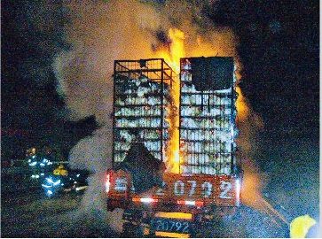 昨晚7時(shí)許,太舊高速公路去往太原方向435公里處,一輛運(yùn)送烏雞的貨車(chē)在行駛中輪胎突然起火。經(jīng)過(guò)陽(yáng)泉消防人員40分鐘的緊急撲救,終于撲滅了大火,解救了差點(diǎn)變成“燒雞”的3000只烏雞。