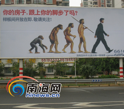 (海南)?诤5閸u某樓盤廣告內(nèi)容與人類進化掛鉤,看到該廣告的市民都覺得受了莫大的侮辱,認為該廣告有辱公民道德風尚,要求相關部門依法取締并查處。然而記者進一步調(diào)查發(fā)現(xiàn),該廣告已通過工商部門審批,核發(fā)了許可證,網(wǎng)友直指該廣告低俗。