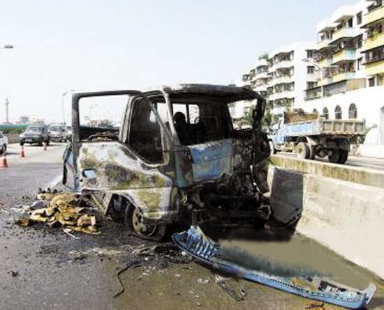 江門市區(qū)一小貨車前天上午與清掃車相撞失火,小貨車司機被困駕駛室因失救而被燒死。