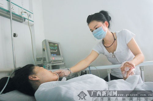11月8日中午,記者根據(jù)帖子上所留的手機號碼聯(lián)系上了楊霏!敖憬,你睜開眼睛看看我啊,睜大一點,乖,就是這樣!”當天12時30分,在廣西醫(yī)科大一附院神經(jīng)內(nèi)科一病區(qū)7樓的病房,楊霏和剛進食完的姐姐在說話。楊霏的大姐楊耀仙躺在病床上,鼻口插著氧氣管,整個身體干瘦得只剩下皮包骨頭,神志也是迷糊不清。楊耀仙現(xiàn)在不能自行進食,只能靠親人從連接在身體上的幾條塑料管注射一些醫(yī)院配制的流體食物維持生命。而楊霏也不時拿起姐姐的手和腳做一些物理按摩!拔医憬氵@兩天病情有所變重了!币姷接浾,她給姐姐蓋好被子,示意到樓梯口說話。