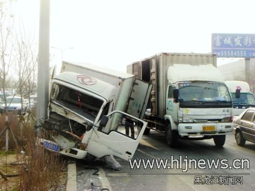 今日10時許,在哈市哈平路農(nóng)機研究院路段,一輛白色廂式貨車行駛中前方車輛突然減速,貨車剎車不及只能轉(zhuǎn)向躲避,沖上路面的隔離帶撞到一根鐵柱方才停下。貨車駕駛室嚴重變形,破碎的風擋玻璃和機器零件散落一地,司機大腿被卡住。
