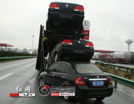 當(dāng)日下午4點20分左右,高速交警邵懷大隊隆回中隊民警黃始杰、羅權(quán)趕到事發(fā)現(xiàn)場,在由東往西方向的洞口服務(wù)區(qū)入口處,一輛牌號為湘E1B1**的尼桑小車一頭撞進牌號為吉A955**的掛車尾部,將掛車車尾所裝載的捷達小車高高的頂起,而尼桑小車的左前輪在劇烈的撞擊下已經(jīng)破裂。