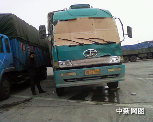 車停下后,只見該車司機(jī)被凍的臉色發(fā)紫,不停地搓手取暖。詢問得知,該司機(jī)姓李,山東人,幾天前李某到武漢拉貨,在湖北境內(nèi)發(fā)生交通事故,導(dǎo)致貨車駕駛室前部凹陷,擋風(fēng)玻璃破碎。為趕時間送貨,于是李某找來廢舊紙板代替擋風(fēng)玻璃。李某告訴民警,車多時他就把頭伸出駕駛室看方向,伸累了就憑感覺判斷方向開車,他就這樣提心吊膽的行駛了數(shù)百公里。