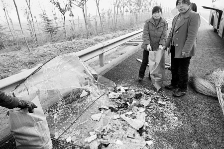 此時,距離3輛車相撞不到100米的路對面,西安前往富平方向的車道上,一輛從西安到合陽的大客車,車前駕駛室位置已經(jīng)完全凹陷,駕駛座椅被撞得掀起,車頭左前角已殘破不堪。一位中年女士臉上掛著血跡,正站在高速路邊,一臉地焦灼。她姓孟,就是這輛受損客車的車主,正等候拖車拖走事故車。她告訴記者,她的車上拉了15名乘客!按蠹s10點半,走到這兒看見前面有消防車,像是出事了。霧太大,還沒看清楚咋回事,玻璃就飛濺到臉上了。這才意識到追尾了,‘追’了前面的一輛油罐車”。