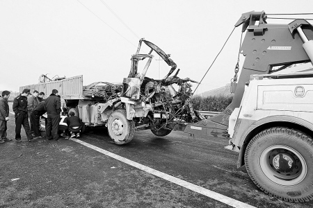 昨天下午,記者趕到西禹高速時,省公安廳交警總隊高交支隊的民警正在指揮清障車拖拉車號為陜E2679的一輛半掛貨車。這輛滿拉著鋼材的半掛貨車,駕駛室受撞擠壓成扁平狀,已被燒成黑色。如果不是右側(cè)車身伸出扭曲的車門,幾乎無法讓人判斷出這里就是車頭。省交警總隊高交支隊一大隊事故科科長楊大偉介紹,這輛車的司機和副駕駛座上的人均已當場死亡。