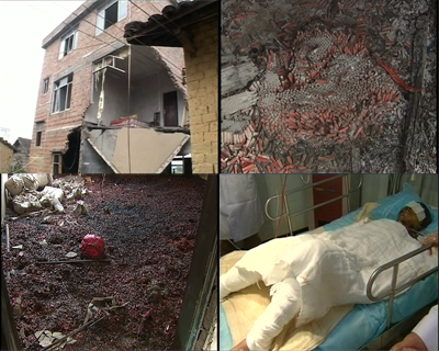 記者:“在這個(gè)事故現(xiàn)場(chǎng),我們也可以看到這里已經(jīng)是一片狼藉,這個(gè)樓馬上已經(jīng)要塌陷了,這個(gè)地上到處布滿了炮筒,這些應(yīng)該是一盤已經(jīng)裝好火藥的煙花,這里我們看到滿地都是炮筒,這個(gè)房間正是布滿了整整一層的炮筒,在現(xiàn)場(chǎng)我們注意到有這樣一口鐘,我注意到時(shí)針指得是7點(diǎn)46分,也就是說(shuō)這口鐘將永遠(yuǎn)將定格在11月12日7點(diǎn)46分事故發(fā)生的那個(gè)時(shí)間!