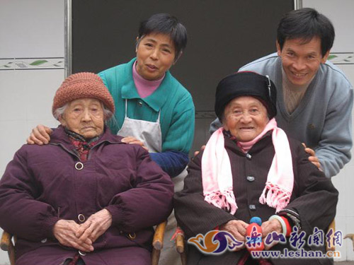 樂山市中區(qū)青平鎮(zhèn)傳有一段佳話:寶興村的王云清大孝感天,贍養(yǎng)的兩位百歲母親因此福壽延年,身康體健。母親李叔華,94歲,岳母李玉容,100歲,兩位壽星竟同降一屋。12年來,這對親家母在子孫們的供養(yǎng)下形同姐妹,朝夕相處,盡享天倫之樂。