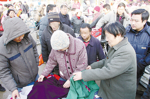 在一個小攤兒上,一位老大媽看上了一件毛衣,正在討價還價,先前的兩個老人擠了上來。老漢擠住買毛衣的老大媽,老太太左手抓起一件毛衣作掩護,右手伸進了老大媽左側(cè)的口袋,把錢掏走了。