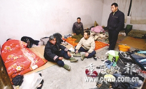 工人關(guān)洪云說,大家以為在11月工程完工后就能結(jié)算工錢回家,都沒有準(zhǔn)備在重慶過冬的衣物和鋪蓋。天寒地凍,工人們晚上睡覺不敢脫衣服。65歲的老工人朱云正感冒了,冷得瑟瑟發(fā)抖,由于沒錢治病,只能硬扛著。好心的工友們將兩床厚被子蓋在他的身上取暖,但他依然冷得發(fā)抖。