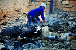 劉奶奶的棺木,被吃力地放下土坑,沉重的棺木里,是老人輕微的尸骨———老人的尸體已在劉愛兵放的那把烈火中燒毀,親人們只尋到些許碎骨。
