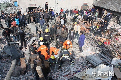 當日下午13時14分,瑞安市消防大隊接到報警后,迅速調集公安現(xiàn)役消防隊及專職消防隊6輛消防車30名指戰(zhàn)員趕到現(xiàn)場實施救援。消防官兵到達現(xiàn)場時,現(xiàn)場一片狼藉,百余平方米的房屋已成為廢墟,現(xiàn)場嘈雜聲混成一片,爆炸現(xiàn)場多處起火,火魔開始向倒塌民房蔓延,而廢墟下面有多條生命等待著救援,現(xiàn)場情況十分危急。消防官兵立即出兩支高壓水槍對火勢進行控制,同時救援小組迅速展開營救。