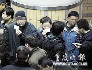 突然,一個(gè)很地道的京腔傳來(lái):“有沒有人到成都,我有兩張今天到成都的票!钡珱]人理會(huì)。過(guò)了一會(huì),那個(gè)票販又回來(lái)了,這次他喊的是“有沒有人到重慶,我有兩張五號(hào)到重慶的票!绷⒓次簧偃,記者與票販搭上了話。