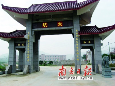 大坑村是一個(gè)偏遠(yuǎn)的革命老區(qū)村。從鎮(zhèn)場(chǎng)輾轉(zhuǎn)乘車幾公里,遠(yuǎn)遠(yuǎn)可見(jiàn)青瓦大理石牌坊高聳于村口,上面紙貼的“大坑”二字顯得粗糙而扎眼。