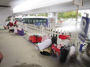市場關(guān)門放假之后,那些滯留在門口的民工只好收拾好行囊,和其他工友聯(lián)系住處。一位安徽籍民工告訴記者,他和其他幾個(gè)老鄉(xiāng)準(zhǔn)備去另一個(gè)老鄉(xiāng)打工的工地那里暫時(shí)住兩天。放假了工地也停工,但是住的地方還是有的。而還有一些民工索性又將行李搬到了安德門地鐵站附近的高架橋下,“現(xiàn)在工作也不好找,住旅館實(shí)在太貴,我們只好再住回高架橋下!泵窆儼徇M(jìn)高架橋下后,個(gè)個(gè)哀聲嘆氣,但也有一些情緒樂觀的,跑進(jìn)了地鐵站內(nèi)打撲克取暖消遣。(記者 曹盧杰 裴睿)
