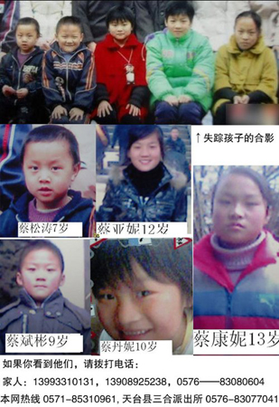 2月18日,天臺縣三合鎮(zhèn)下路王村的蔡修明、蔡修通兄弟家的5名兒童突然失蹤。據(jù)了解,蔡家兄弟常年在甘肅做生意。過年期間,蔡家兄弟帶兒女們回老家過年。2月18日14時許,蔡修通13歲的女兒蔡亞妮帶著3個親姐弟及蔡修明的小兒子蔡松濤,去1公里外的同誼村找同學(xué)玩。一小時后,蔡亞妮的母親發(fā)現(xiàn)找不到女兒了。隨即,蔡家人發(fā)動全村親友尋找。但村民兩百余人遍尋周邊村莊、山上、湖泊都未找到。