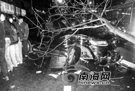 8日晚上9點(diǎn)多鐘,一輛牌號(hào)為“瓊A·G7075”的越野車在人多車多的?谖逯干铰飞习l(fā)瘋,它從機(jī)動(dòng)車道上撞上人行道,接連撞倒了8輛車、撞斷了2棵樹(shù),還把一個(gè)人給撞飛。它沖出50米遠(yuǎn)后“摔”斷右前輪才停下來(lái)。